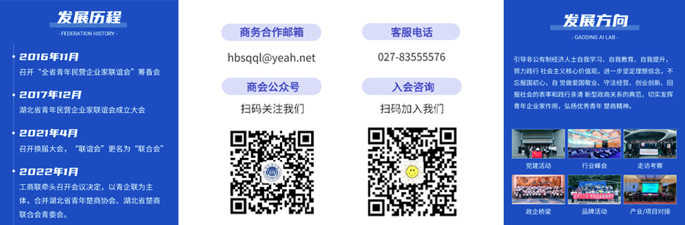 —— 湖北省青年民营企业家联合会(简称“湖北省青企联”)是在省委统战部、省工商联的关怀、领导和支持下,由湖北省内家族企业传承人、青年创业者等年轻一代非公有制经济代表人士,于2017年12月共同发起成立的一家全省性、联合性、非营利性社会团体。2022年1月整合湖北省青年楚商协会、湖北省楚商联合会青委会(少帅会)。湖北省青企联是湖北省工商联直属商会之一,接受湖北省民政厅监督管理和省工商联的业务指导。湖北省青企联为会员企业与时俱进不断创新,优化服务职能,联合一批有实力的战略合作伙伴,利用信息共享、资源置换、优势互补, 构筑多方合作发展新平台、新机制,进一步实现资源整合、技术连接、抱团发展等,实现商会与会员企业共同跨越式发展。现有三大服务中心,包括金融服务、商务顾问、企业管理、文化传播等多项服务。 more > 湖北省青企联入会标准 (2021-2025)